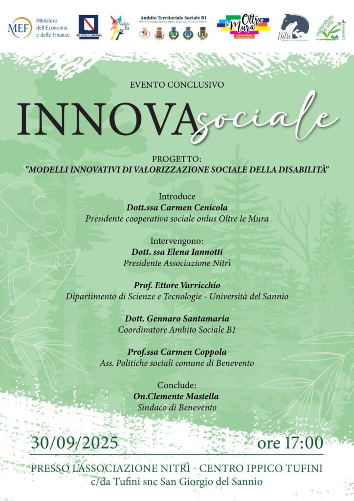 Martedì 30 settembre 2025, alle ore 17:00, presso l’Associazione Nitrì-Centro ippico Tufini a San Giorgio del Sannio, si terrà l’evento conclusivo del progetto ‘InnovaSociale’-Modelli innovativi di valorizzazione sociale della disabilità’. Questo progetto è stato promosso dall’Ambito sociale B1, con il Comune di Benevento come capofila insieme ai partner Oltre le Mura (coop sociale onlus), Associazione Nitrì, Agricoltura è vita-Cia Campania. Sarà un’occasione per presentare il percorso svolto, i risultati ottenuti e le prospettive future di inclusione sociale e valorizzazione delle persone con disabilità.